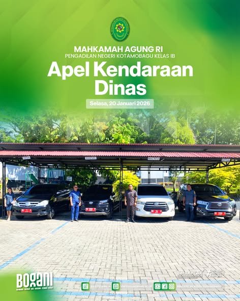 Wakil Ketua Pengadilan Negeri Kotamobagu Bapak Mooris M. Sihombing, S.H., M.H., bersama Sekretaris Bapak Stenly Wewengkang, S.E. dan Staff Bagian Umum & Keuangan melaksanakan Apel kendaraan dinas untuk pengecekan fisik kendaraan beserta kelangkapan Surat-Surat kendaraan, Bertempat di halaman PN Kotamobagu.