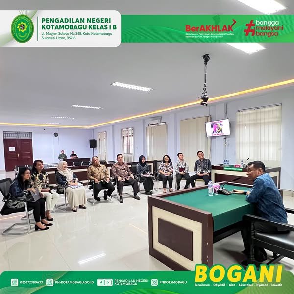 Bertempat di Ruang Sidang Utama Pengadilan Negeri Kotamobagu. Ketua Pengadilan Tinggi Manado YM Bpk. Amin Sutikno, S.H., M.H. mengadakan Bimbingan Teknis tentang Teknis Yudisial bagi Ketua Pengadilan Negeri Kotamobagu Bpk. Jifly Z. Adam, S.H., M.H., Wakil Ketua Bpk. Wempy W. J. Duka, S.H., M.H., bersama seluruh Hakim pada Pengadilan Negeri Kotamobagu