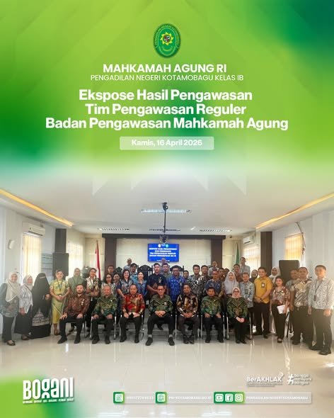 Pengadilan Negeri Kotamobagu Kelas I B melaksanakan kegiatan Ekspose Hasil Pengawasan oleh Tim Pengawasan Reguler Badan Pengawasan Mahkamah Agung Republik Indonesia.