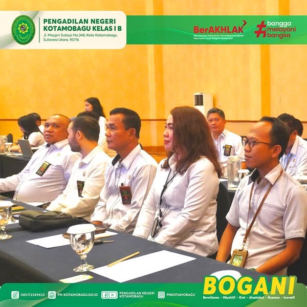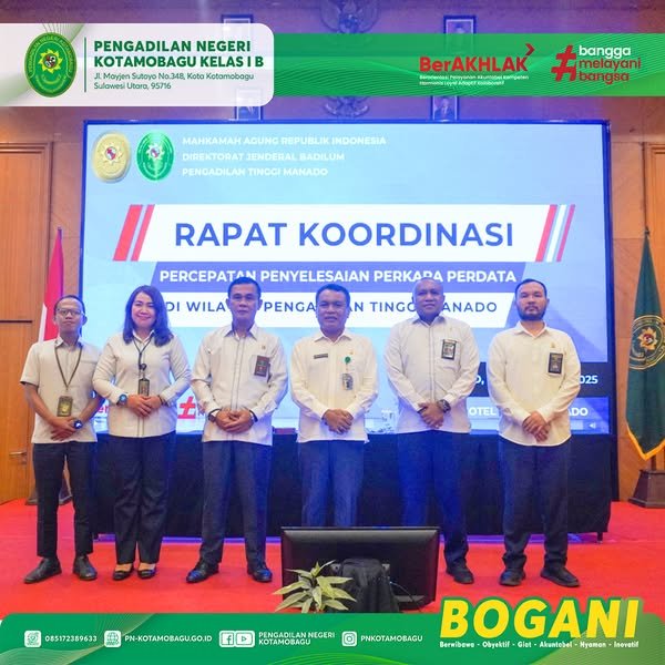 Pengadilan Negeri Kotamobagu Kelas I B mengikuti Kegiatan Rapat Koordinasi Percepatan Penyelesaian Perkara Perdata yang digelar di Hotel Aston Manado yang diadakan oleh Pengadilan Tinggi Manado. Kegiatan ini diikuti oleh Wakil Ketua Pengadilan Negeri Kotamobagu Bpk. Wempy W. J. Duka, S.H., M.H., Hakim Bpk. Hengky P. Simanjuntak, S.H., Panitera Bpk. James M. Masili, S.H., Panmud Perdata Ibu. Sri Wahyuni Kangiden, S.H., M.H., dan Staf bagian Perdata Bpk. Mukhamad Khabibulloh, S.H.
