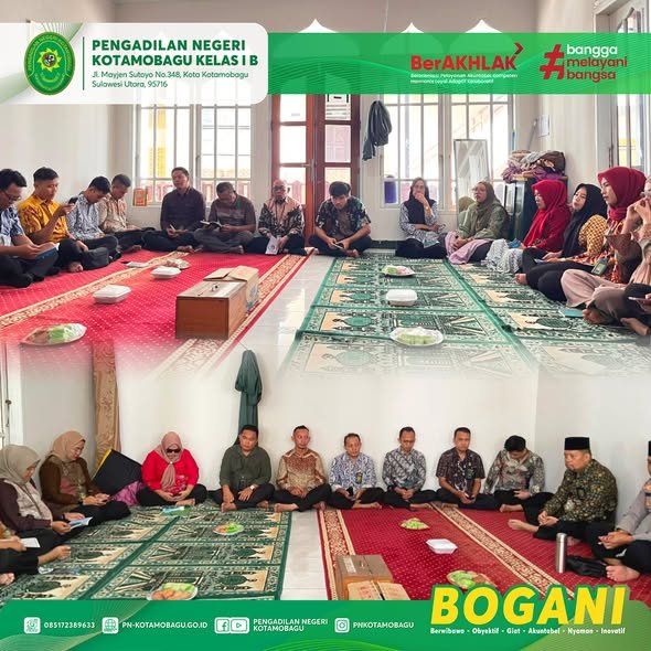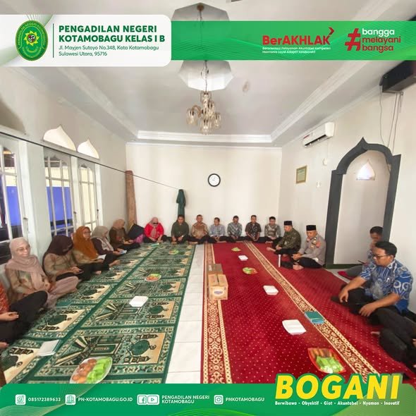 Umat Muslim di lingkungan Pengadilan Negeri Kotamobagu Kelas I B melaksanakan kegiatan rutin Pengajian (Yasinan) bulanan, yang dihadiri langsung oleh Yang Mulia Ketua Pengadilan Negeri Kotamobagu, Bapak Yajid, S.H., M.H., bersama majelis Mushola At-Taubah.