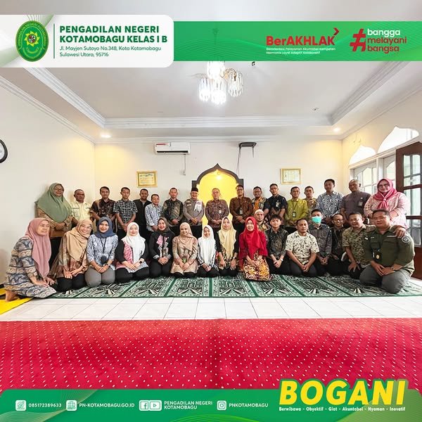 Umat Muslim di lingkungan Pengadilan Negeri Kotamobagu Kelas I B melaksanakan kegiatan rutin Pengajian (Yasinan) bulanan, yang dihadiri langsung oleh Yang Mulia Ketua Pengadilan Negeri Kotamobagu, Bapak Jifly Z. Adam, S.H., M.H., bersama majelis Mushola At-Taubah.