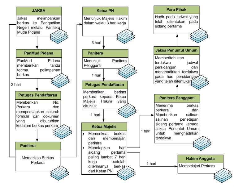 - pelaksanaan distribusi perkara yang telah diregister untuk diteruskan kepada Ketua Majelis Hakim berdasarkan Penetapan Penunjukkan Majelis Hakim dari Ketua Pengadilan;
