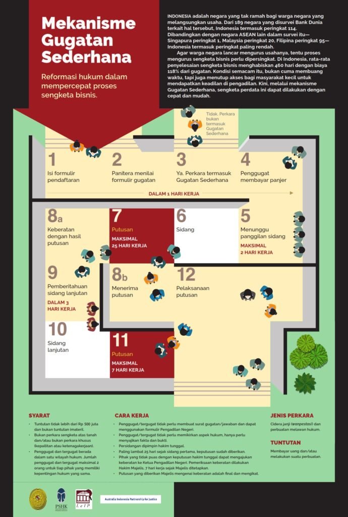 Gugatan Sederhana atau Small Claim Court adalah tata cara pemeriksaan di persidangan terhadap gugatan perdata dengan nilai gugatan materil paling banyak Rp 500 juta yang diselesaikan dengan tata cara dan pembuktiannya sederhana. Perbedaan gugatan sederhana dengan gugatan pada umumnya adalah nilai kerugian materiil yang lebih khusus ditentukan pada gugatan sederhana, yakni maksimal Rp 500 juta. Sedangkan pada gugatan pada perkara perdata biasa, nilai kerugian materiil tidak dibatasi besarnya. Di samping itu, gugatan sederhana ini diperiksa dan diputus oleh hakim tunggal dalam lingkup kewenangan peradilan umum.