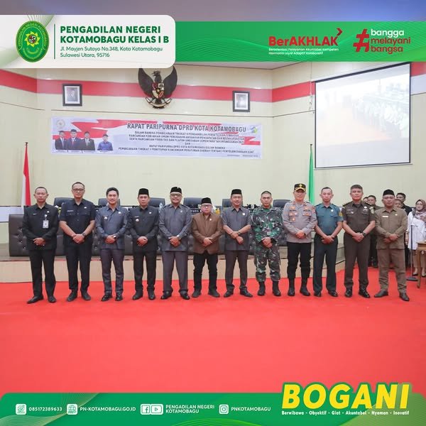 YM Ketua Pengadilan Negeri Kotamobagu Kelas I B yang diwakili Bapak Sopian Daud, S.H. (Jurusita), menghadiri Undangan Dewan Perwakilan Rakyat Daerah Kotamobagu dalam rangka Pembicaraan Tingkat II Rancangan Umum Perubahan Anggaran Pendapatan dan Belanja Daerah Tahun 2025 dan Rapat Paripurna Pembicaraan Tingkat II Penetapan Rancangan Peraturan Daerah Tentang Penyelenggaraan Adat.