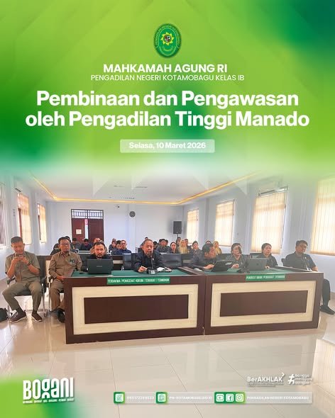 Seluruh Warga Pengadilan Negeri Kotamobagu Kelas I B melaksanakan kegiatan pembinaan dan pengawasan Pengadilan Tinggi Manado secara daring sebagai voorpost/kawal depan Mahkamah Agung RI terhadap penyelenggaraan Peradilan dan penguatan integritas pada Pengadilan Negeri Se-Sulawesi Utara untuk mewujudkan Peradilan yang bersih, profesional, transparan dan akuntabel.