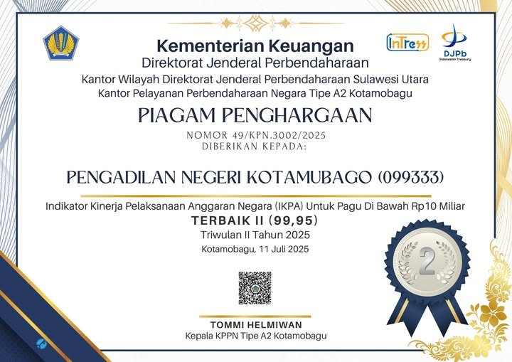 Pengadilan Negeri Kotamobagu memperoleh Penghargaan Atas Indikator Kinerja Pelaksanaan Anggaran Negara (IKPA) Periode Triwulan II Tahun 2025.