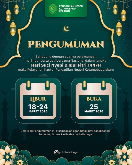 Sehubung dengan adanya pelaksanaan hari libur Nasional dalam rangka Hari Suci Nyepi Tahun Baru Saka 1948 & Hari Raya Idul Fitri 1447 H maka pelayanan Kantor Pengadilan Negeri Kotamobagu akan :