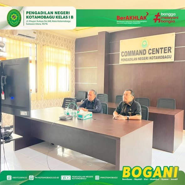 YM Ketua Pengadilan Negeri Kotamobagu Kelas I B Bapak Yajid, S.H., M.H., di dampingi Wakil Ketua Bapak Mooris M. Sihombing, S.H., M.H. mengikuti kegiatan Zoom Meeting yang diadakan oleh Direktorat Jenderal Badan Peradilan Umum dalam rangka penyerahan Penghargaan Abhinaya Upangga Wisesa dan pembinaan pimpinan Mahkamah Agung RI.