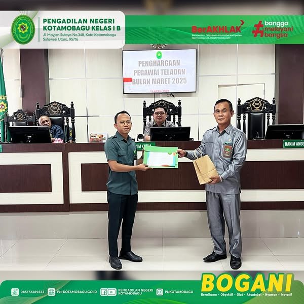 Penyerahan Penghargaan kepada Pegawai dan Honorer Teladan Bulan Maret 2025 yang diserahkan oleh Panitera dan Sekretaris PN Kotamobagu.