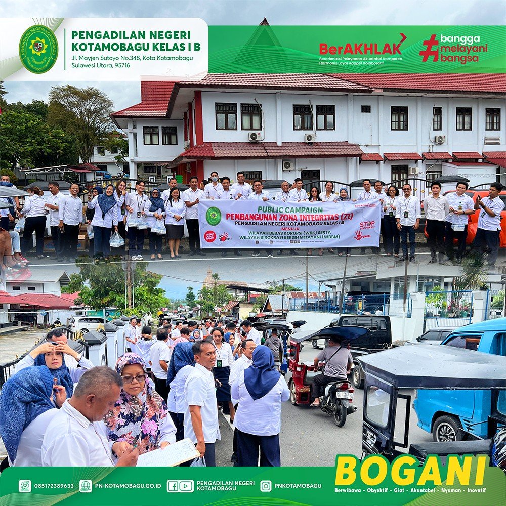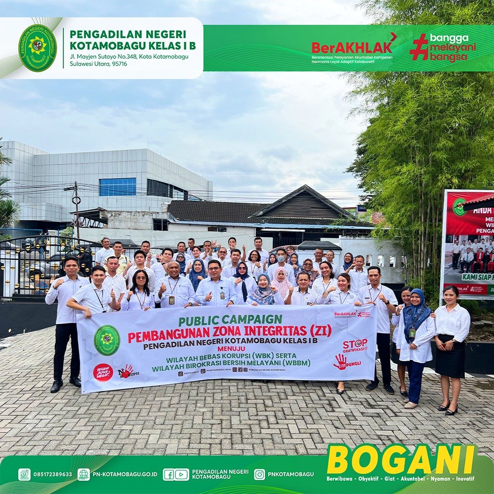 Bertempat di halaman kantor, Pengadilan Negeri Kotamobagu kelas I B melaksanakan Public Campaign Pembangunan Zona Integritas(ZI) menuju Wilayah Bebas Korupsi (WBK) serta Wilayah Birokrasi Bersih Melayani (WBBM) serta dirangkaikan dengan Berbagi Berkah Ramadhan/ Berbagi Takjil.