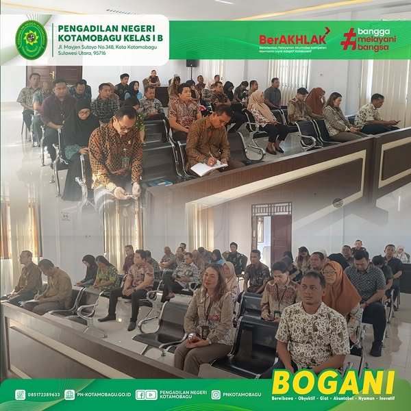 Rapat ini dipimpin YM Ketua Pengadilan Negeri Kotamobagu Kelas I B Bpk. Jifly Z. Adam, S.H.,M.H didampingi YM Wakil Ketua Bpk. Wempy W.J Duka, S.H.,M.H. dan diikuti seluruh Jajaran Hakim, ASN, PPNPN dan Honorer PN Kotamobagu.