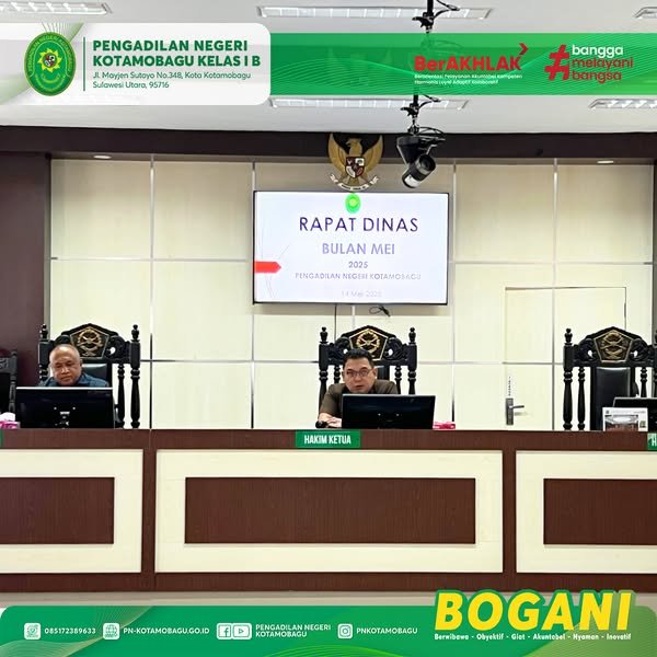 Ketua Pengadilan Negeri Kotamobagu Kelas I B, Yang Mulia Bapak Jifly Z. Adam, S.H., M.H., didampingi oleh Wakil Ketua Bapak Wempy W. J. Duka, S.H., M.H., memimpin kegiatan Rapat Dinas Bulan Mei 2025.