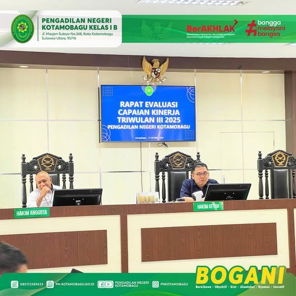 Ketua Pengadilan Negeri Kotamobagu Kelas I B, Yang Mulia Bapak Jifly Z. Adam, S.H., M.H., didampingi oleh Wakil Ketua Bapak Wempy W. J. Duka, S.H., M.H., memimpin kegiatan Rapat Evaluasi Capaian Kinerja Triwulan III Tahun 2025.