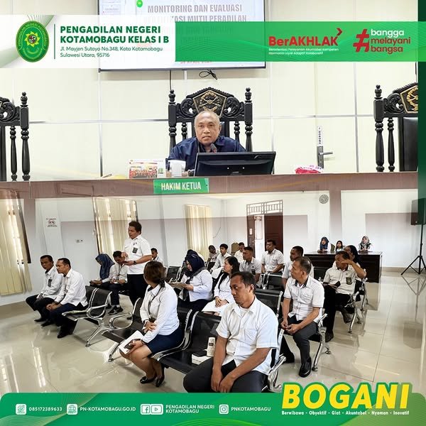 Bertempat di Ruang Sidang Utama, Wakil Ketua PN Kotamobagu, Bpk. Wmpy W.J. Duka, SH.,M.H. memimpin Rapat Monitoring dan Evaluasi Pelaksanaan AMPUH.