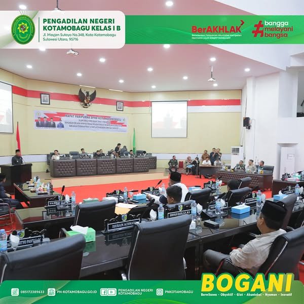 YM Ketua Pengadilan Negeri Kotamobagu Kelas I B yang diwakili Bapak Sopian Daud, S.H. (Jurusita), menghadiri Undangan Dewan Perwakilan Rakyat Daerah Kotamobagu dalam rangka Rapat Paripurna Pembicaraan Tingkat I Penyampaian Rancangan Kebijakan Umum Perubahan Anggaran Pendapatan dan Belanja Daerah serta Rancangan Perubahan Prioritas dan Plafon Anggaran Sementara Tahun 2025.