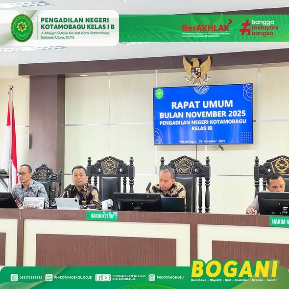 Ketua Pengadilan Negeri Kotamobagu Kelas I B, Yang Mulia Bapak Yajid, S.H., M.H., didampingi oleh Wakil Ketua Bapak Mooris M. Sihombing, S.H., M.H., dan Panitera serta Sekretaris memimpin kegiatan Rapat Umum Bulan November 2025.