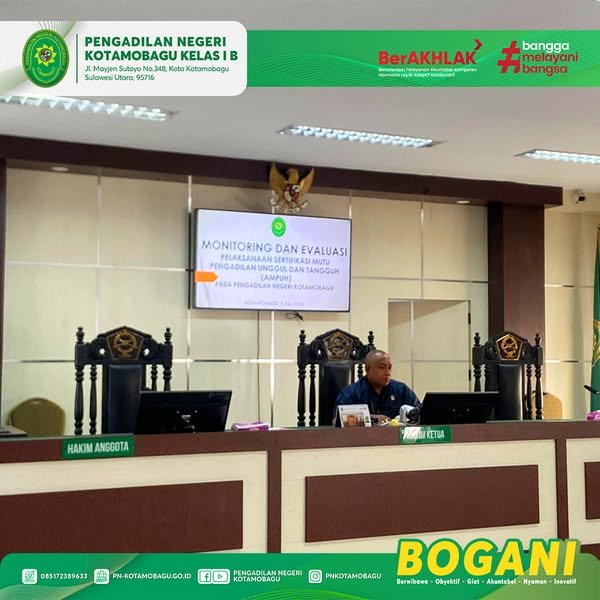 Pengadilan Negeri Kotamobagu Kelas I B melaksanakan kegiatan Monitoring dan Evaluasi pelaksanaan Sertifikasi Mutu Pengadilan Unggul dan Tangguh (AMPUH).