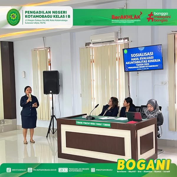 Wakil Ketua Pengadilan Negeri Kotamobagu Kelas I B, Yang Mulia Bapak Wempy W. J. Duka, S.H., M.H., turut serta mengikuti kegiatan Sosialisasi Hasil Evaluasi Akuntabilitas Kinerja Tahun 2024 yang dipresentasikan oleh Kasubbag PTIP Ibu. Sani R. Tenda, S.H.