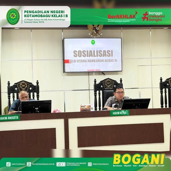 Pengadilan Negeri Kotamobagu menyelenggarakan kegiatan Sosialisasi Nilai Utama Mahkamah Agung RI yang disampaikan oleh Ketua PN Kotamobagu, Bpk. Jifly Z. Adam, SH.,MH.