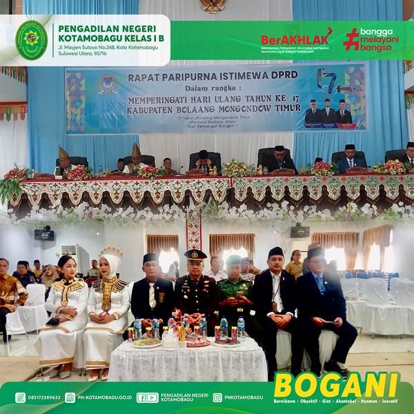 Pengadilan Negeri Kotamobagu Kelas I B, yang diwakili oleh Bapak James M. Masili, S.H. (Panitera), menghadiri Upacara Peringatan Hari Ulang Tahun ke-17 Kabupaten Bolaang Mongondow Timur yang diselenggarakan oleh Pemerintah Kabupaten Bolaang Mongondow Timur.