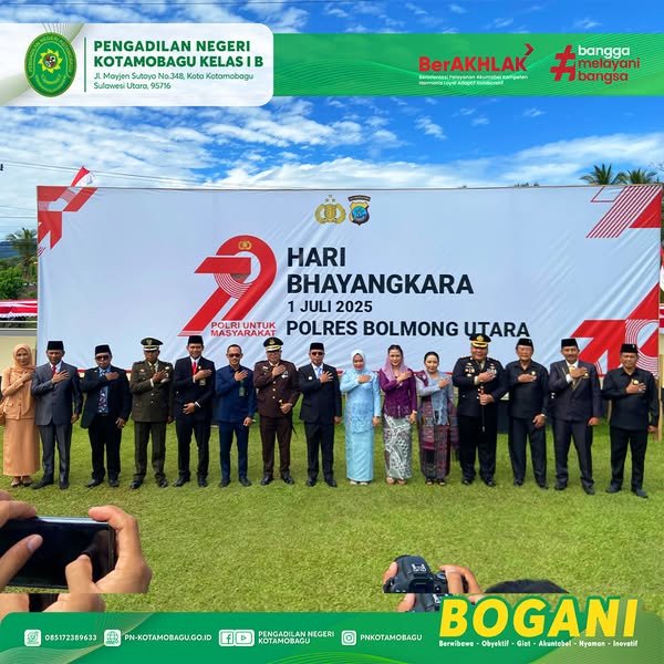Dalam rangka memperingati Hari Bhayangkara ke-79, Ketua Pengadilan Negeri Kotamobagu Kelas I B, yang diwakili oleh Bapak Stenly Wewengkang, S.E. (Sekretaris), menghadiri Upacara Peringatan Hari Bhayangkara yang diselenggarakan oleh Kepolisian Resor Bolaang Mongondow Utara.