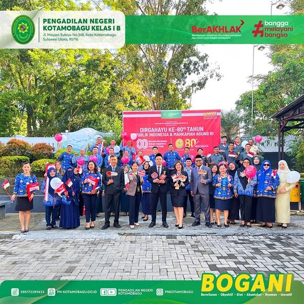 Keluarga Besar Pengadilan Negeri Kotamobagu Kelas I B menggelar Upacara Peringatan HUT ke – 80 Kemerdekaan Republik Indonesia di halaman Kantor. Sebagai Inspektur Upacara Bpk. Sulharman, S.H., M.H., diikuti oleh para Hakim, Pegawai, dan Honorer.