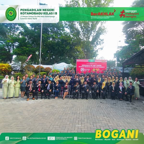 Keluarga Besar Pengadilan Negeri Kotamobagu Kelas I B menggelar Upacara Peringatan HUT ke – 80 Mahkamah Agung Republik Indonesia di halaman Kantor. Sebagai Inspektur Upacara YM Ketua Pengadilan Negeri Kotamobagu Bpk. Jifly Z. Adam, S.H., M.H. Upacara Hari Ini turut dihadiri juga Pengadilan Agama Kotamobagu dan diikuti oleh para Hakim, Pegawai, dan Honorer.